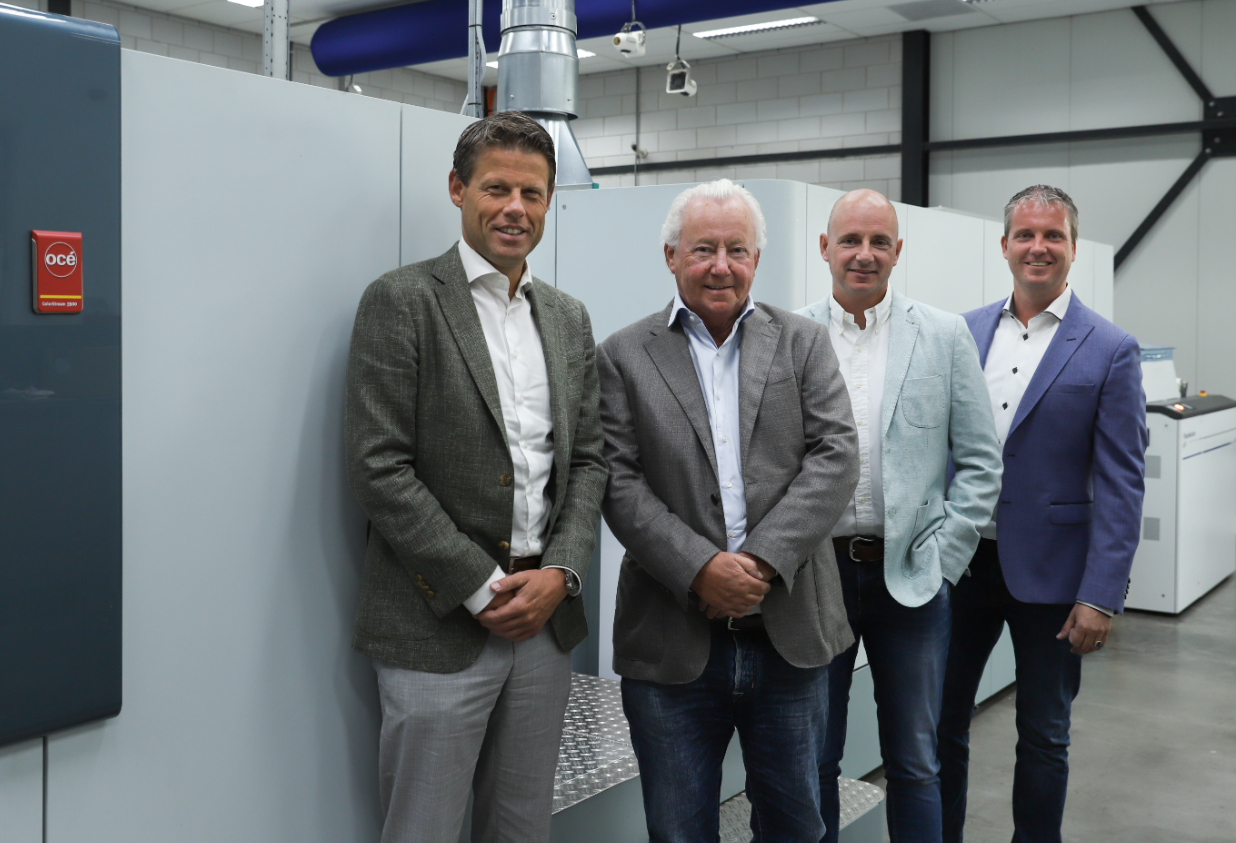 Foto: (vlnr) Frank Huigen (Canon) met de directie van Intermail: Gert Rothert Sr, Gert Rothert Jr en Jeroen Rothert.