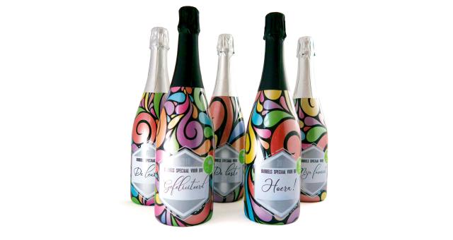 Een korte online demonstratie toont hoe het concept werkt. Na een keuze te hebben gemaakt tussen de verschillende producten, zoals een champagne-, olijfolie-, bier- of wijnfles, klik je verder naar ‘Ontwerp je eigen fles’. Met een paar kliks kies je een design, upload je een foto en voeg je een tekst toe. Met de optie ‘Voorbeeld’ wordt je product getoond in 3D, zodat de besteller nooit voor verrassingen komt te staan. Na akkoord van het 3D-design en betaling gaat het ontwerp richting Geostick. Dat verzamelt de orders en print ze digitaal op krimpsleeves, die vervolgens naar de drankleverancier gaan. Die brengt ze aan en stuurt de gesleevede flessen richting de klant. ‘Het duurt maximaal twee weken voordat een bestelling bij de consument binnen is, maar dat zal in de toekomst terug kunnen naar één week als we meer orders krijgen’, zegt Schouten.
