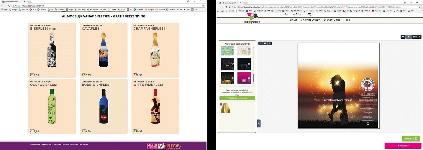 Via bedruktgeschenk.nl kun je je ontwerp op maat maken en bestellen, in dit geval sleeves voor drankflessen