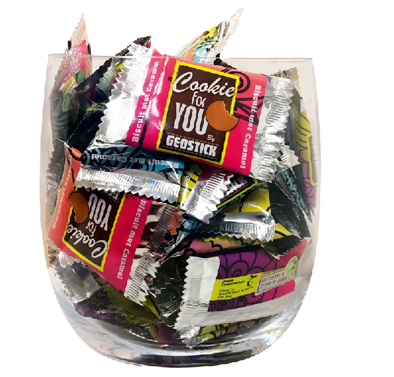 Op de tafel liggen naast de gesleevde flessen ook koekjes die zijn verpakt in folie. Het logo is gelijk, de achtergrond varieert door verschillende designs. ‘Dit doen we met het HP-programma Mosaic’, zegt Schouten. ‘Dat is software die bepaalde elementen uit een ontwerp vertaalt naar duizenden verschillende patronen. De verpakking heeft hiermee een uniforme uitstraling en daarbij is er toch een onderlinge differentiatie. Ieder zakje is uniek. Dit past goed in de trend naar personalisering. Het geeft ieder afzonderlijk product in de schappen een unieke uitstraling.’ ‘Deze verpakking bevat nog een trend’, zegt Erik Steijger (commercieel directeur) enthousiast. ‘Duurzaamheid. De folie is gemaakt van biobased én composteerbaar materiaal. Het betreft een folie op suikerriet-, cellulose- of maïsbasis, die dezelfde performance heeft als conventionele kunststof folies. Het voldoet aan alle voedselveiligheidseisen.’