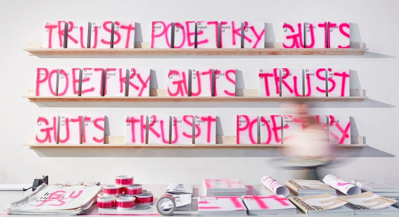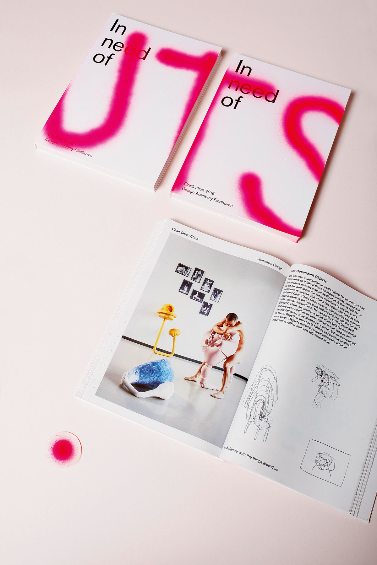 De catalogus “In need of - Graduation 2016” van de Design Academy Eindhoven: rotatiegedrukt krantenpapier voor een urgente nieuws-uitstraling, een luxe hardcover als contrast. De met de hand gesprayde woorden op de omslagen geven de boeken een activistische uitstraling.