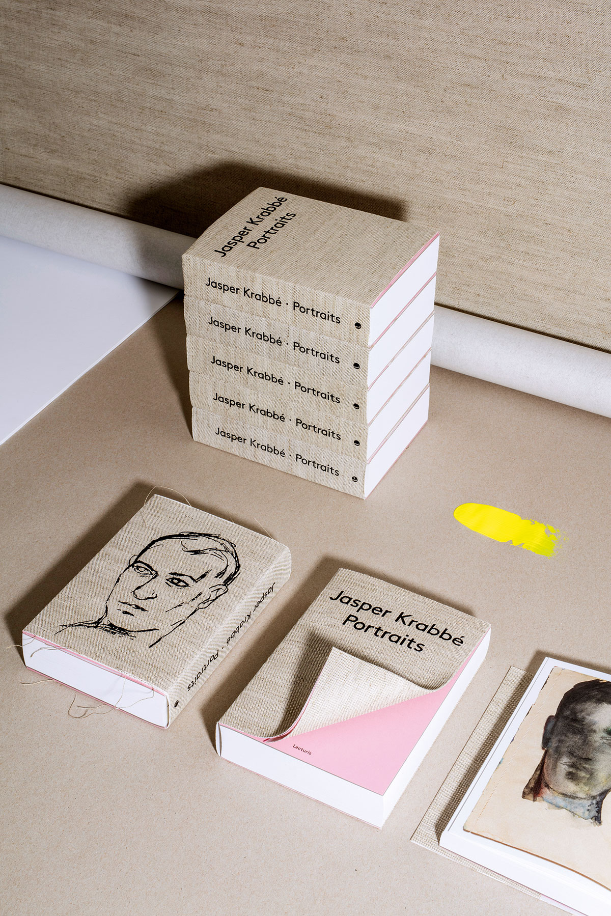Sonja: ‘Ook bij het boek voor Jasper Krabbé - “Portraits” (zie de afbeelding) speelde de keuze van het papier een belangrijke rol. De layout wilden we heel simpel en strikt houden. Het was de keuze van de materialen die het boek karakter moest geven. Een boek dat licht is en soepel in de hand ligt, maar wel een bepaalde dikte heeft. Omdat Jasper vaak op tweedehandse doeken en dekens schildert en in oude cahiers tekent, wilden we geen te wit papier gebruiken. De tint van Munken Print White 1.5 vonden we het meest geschikt. Het papier is licht houthoudend, wat we voor dit project een pluspunt vonden. In de loop van de tijd zal het dezelfde uitstraling krijgen als de tekeningen en schilderijen van Jasper. En het bladert heerlijk!’