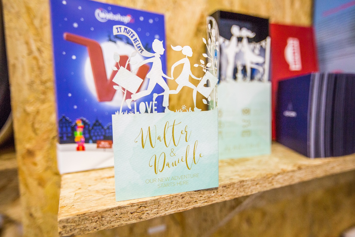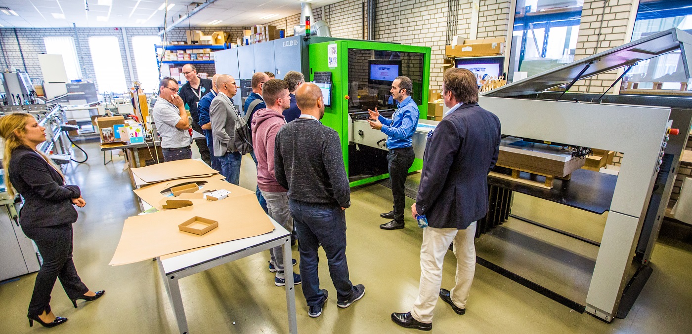Het event dat de ondernemende broers begin september samen met Highcon organiseerden, bood een kijkje in de extreem uitgebreide digitale keuken. Ondertussen staan er maar liefst vier HP Indigo’s, waaronder twee B2-bakbeesten, die per uur zo’n 4.600 vel fullcolour wegdraaien. De directie van de nu zestig man tellende onderneming investeerde dus flink in het digitaliseren van het productieproces. Directeur Joris Bosch vertelde dat de oplagegrootte van alles wat er door de onderneming geproduceerd wordt meestal ligt tussen de 1 en 500 stuks. Om de vraag naar, vaak gepersonaliseerd, op maat gemaakt drukwerk maximaal in te vullen, investeerden de mannen naast de HP’s ook in een Scodix, een digitale veredelmachine, en een Highcon Euclid IIIS. Binnen het hele digitale pakket zit een mooie groei in het segment verpakkingen. Om ook daar snelle levering te realiseren, voegden de gebroeders Bosch recent nog een vouw-plakinstallatie toe aan het afwerkingspeloton.
