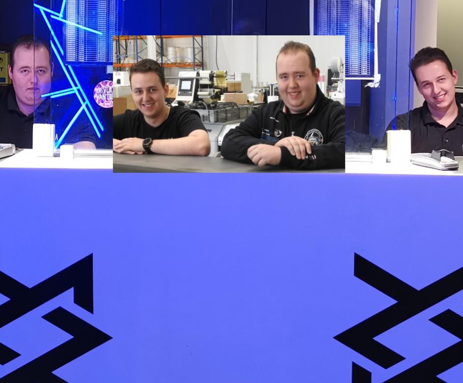 In februari verhuisden de broers Enzo en Gino Venezia hun bedrijf Dutch Graphic Group binnen de gemeente Venlo naar een gloednieuw 2600 vierkante meter tellend pand. De kern van de handel bestaat uit etiketten. ‘Maar we helpen onze klanten met meer dan labels,’ zegt Enzo (uiterst links), de oudste van de twee. ‘Recent hebben we voor een complete display-positie in een supermarkt de productie en de plaatsing verzorgd.’ En, alsof er niet hard genoeg gewerkt wordt; in het weekend werken de mannen in Club Ultra.