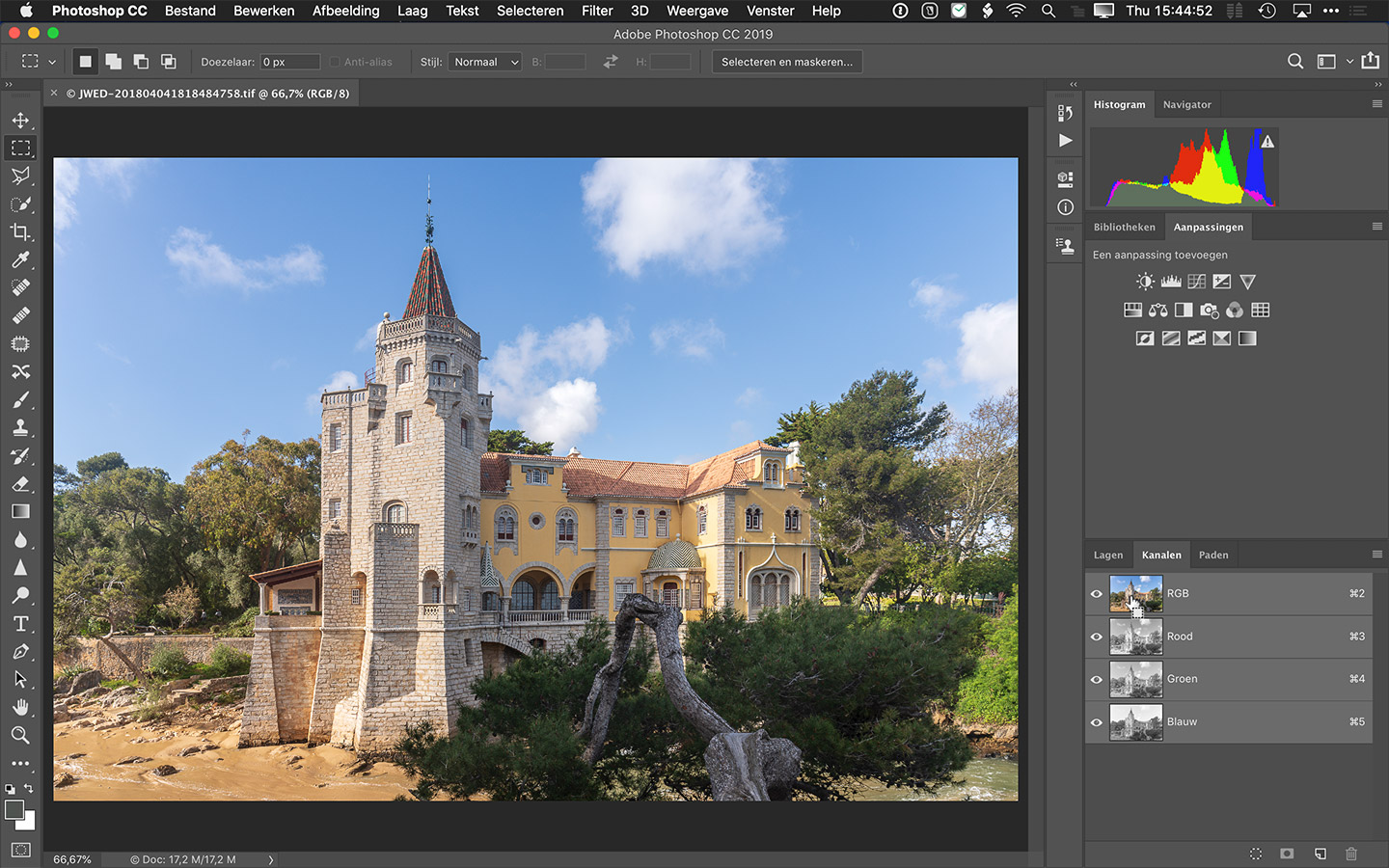 Ga naar het Kanalen-paneel en klik op het RGB-kanaal terwijl je de Cmd-toets (PC: Ctrl-toets) ingedrukt houdt. Hiermee laad je de helderheidswaarden van de foto als selectie