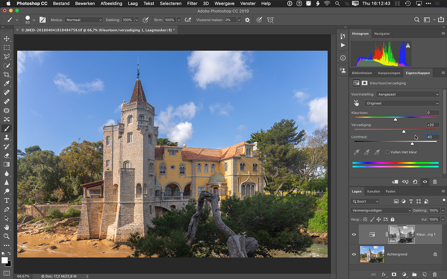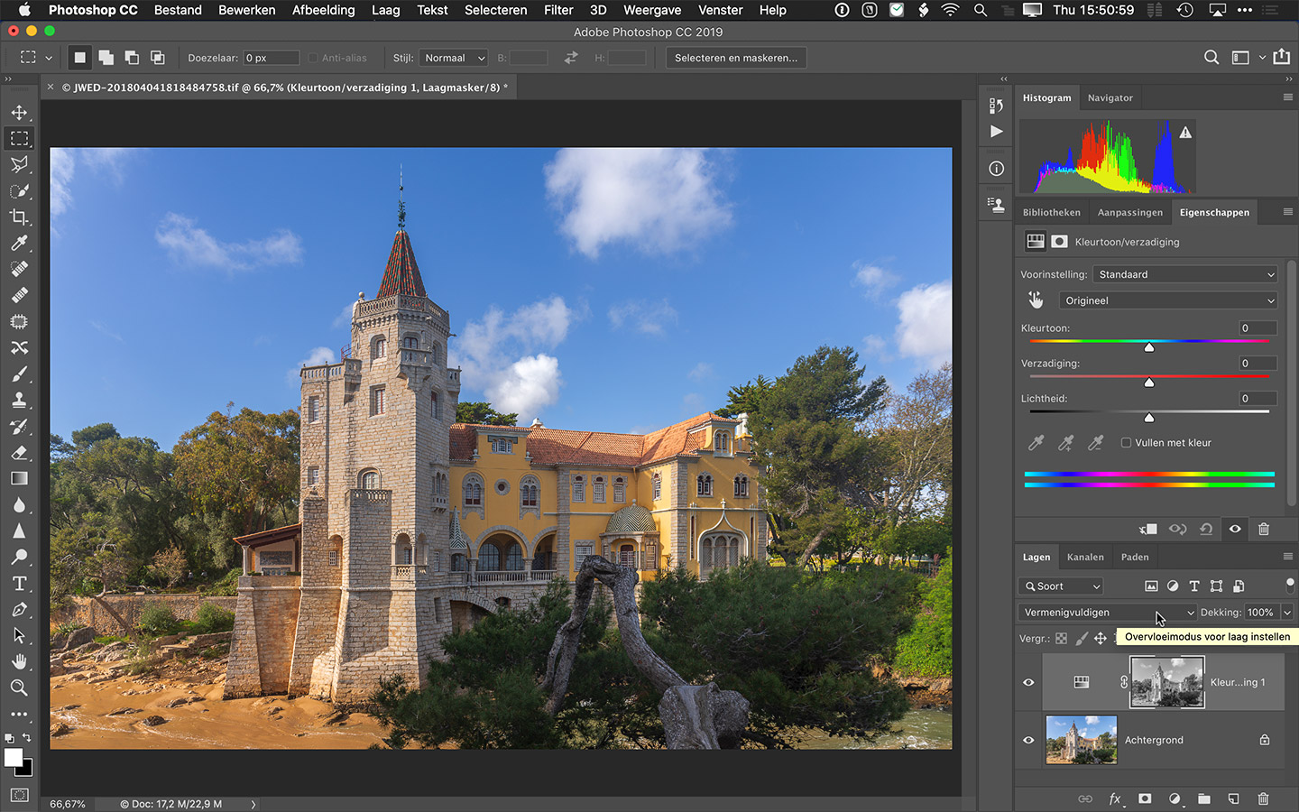 Ga nu naar het Lagen-paneel en voeg een Kleurtoon/verzadiging-aanpassingslaag of een Levendigheid-aanpassingslaag toe. Het voordeel van een Kleurtoon/verzadiging-laag is dat je eventueel ook nog de verzadiging per kleur kunt instellen, het voordeel van een Levendigheid-aanpassingslaag is dat je al meteen een meer 'intelligente' vorm van verzadiging toevoegen krijgt, waarbij minder verzadigde kleuren sterker worden veranderd dan verzadigde kleuren. Wij kozen voor Kleurtoon/verzadiging. Omdat je de helderheidswaarden van de foto geladen had als selectie, kun al je meteen een masker krijgen op basis van die selectie. Zet de overvloeimodus van deze laag op 'Vermenigvuldigen'.