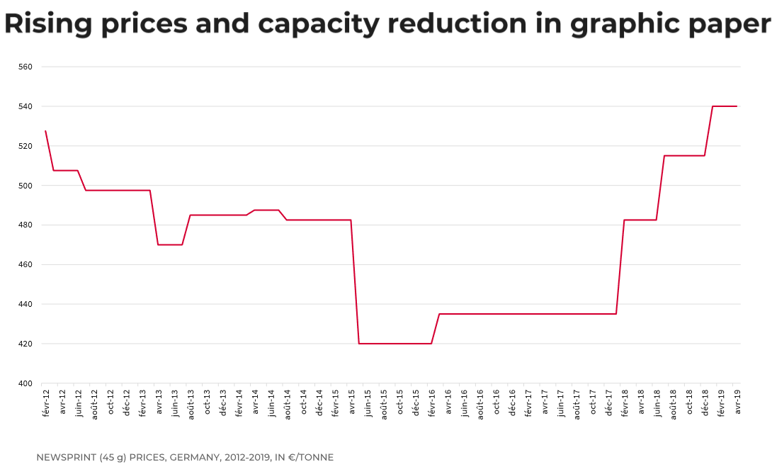 Deze grafiek met de prijs voor 45 grams krantenpapier in Duitsland illustreert het extreem hoge niveau waarop de papierprijzen zich momenteel bevinden.