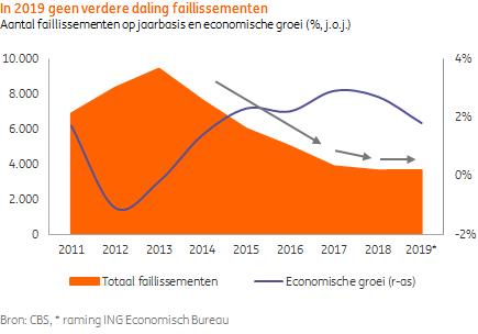 Voor 2019 verwacht het ING Economisch Bureau dat het aantal faillissementen rond hetzelfde niveau als 2018 uitkomt. Voor dit jaar wordt een economische groei verwacht van 1,8%, wat lager is dan voorgaande jaren. Dit betekent dat er geen sterke conjuncturele stimulans meer is om het aantal faillissementen nog verder te laten dalen. Tegelijkertijd zijn er een aantal risico’s die in verschillende sectoren voor onzekerheid zorgen. Denk aan de nog altijd op handen zijnde brexit, het handelsbeleid van de VS en de krappe arbeidsmarkt in Nederland.