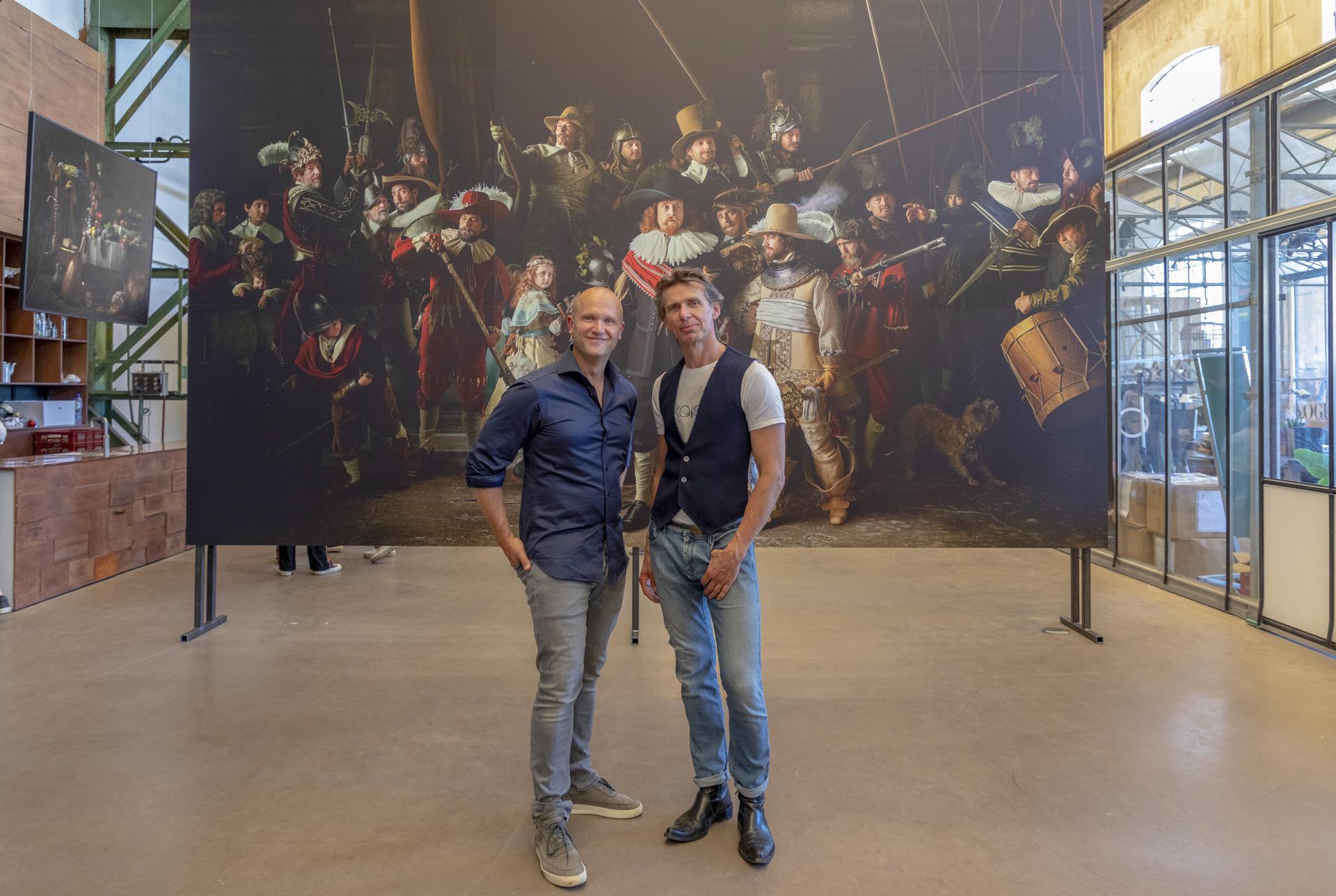 Rooymans moest langs alle uithoeken van het opgedane vakmanschap laveren om op de foto’s het licht van Rembrandt te vangen. ‘Het is bijzonder zacht licht. Omdat we in de expositie met name aandacht geven aan de keerzijde van dit kunstwerk - het leven van de kunstenaar- is ook een setting gemaakt waarbij je als bezoeker bij wijze van spreken de achterzijde van de Nachtwacht ziet, niet de billen van de mensen, maar het leven. Dat betekent dat je om het Rembrandt effect te krijgen, je dan ook het licht moet spiegelen. Maar het resultaat is fantastisch. Ik ben als fotograaf regelmatig teleurgesteld als ik mijn werk terugzie in print. Maar dit is het tegenovergestelde. Het is een droom om je werk zo geprint te zien.’ Foto: fotograaf Julius Rooymans (links) modeontwerper Hans Ubbink.