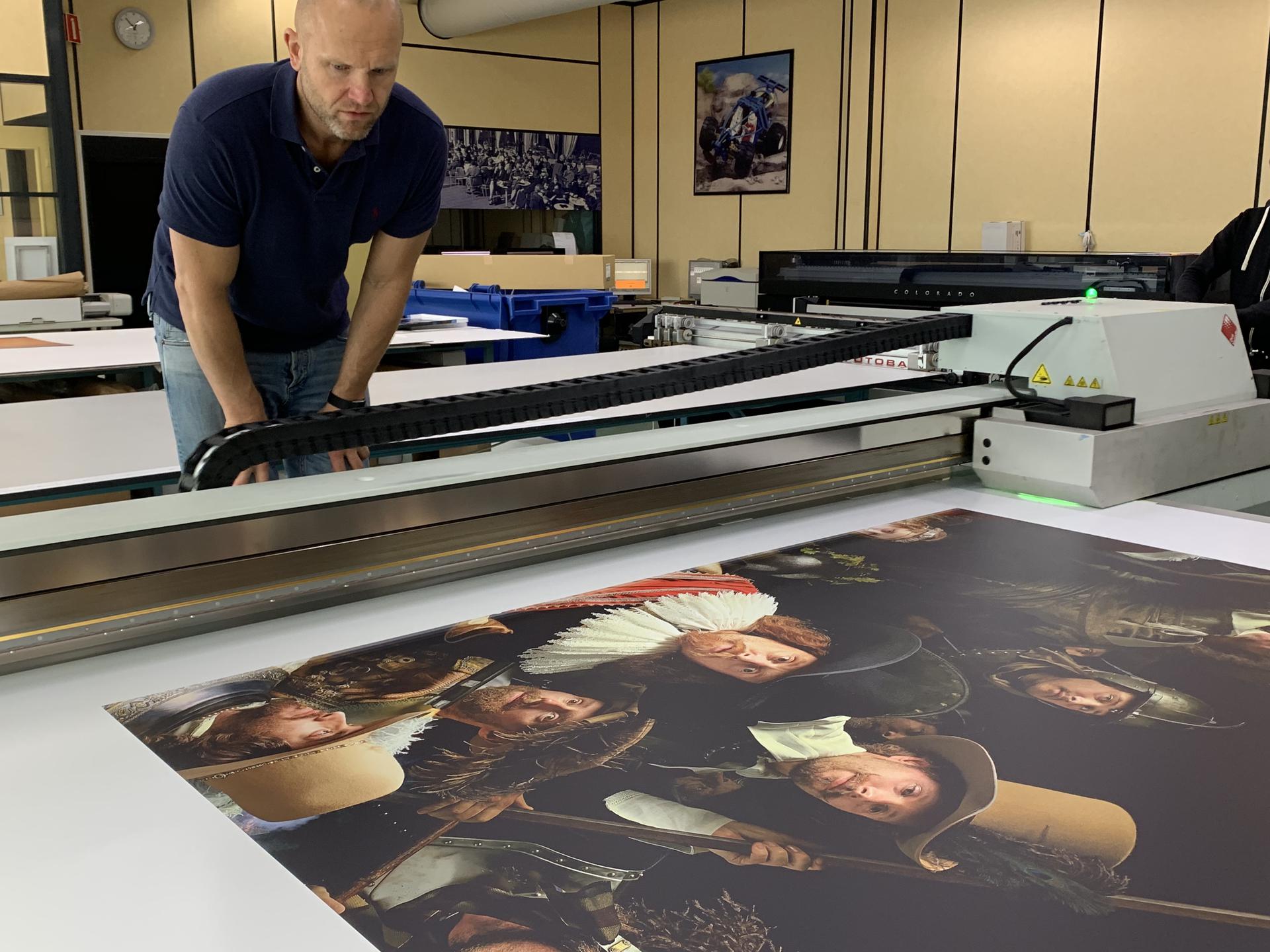 Zoals gezegd is een deel van de print gemaakt door Canon-partner Het Beeldgebouw, onderdeel van Hollandridderkerk. Eigenaar Arno de Winter sloot zich graag bij dit project aan als partner: ‘Zo belangrijk als de kwaliteit van het schilderdoek vroeger was voor Hollandse Meesters als Rembrandt, zo belangrijk is een kwalitatieve print voor moderne ‘meesters’. We hebben ervoor gekozen om de Nachtwacht360 te creëren met de Océ Arizona 480XT printer. Hiermee kunnen we een hoogwaardige print maken die recht doet aan de details die in deze fotografische reproductie zo zorgvuldig in beeld gebracht zijn. We zijn trots op het resultaat en onze bijdrage aan dit bijzondere project.’