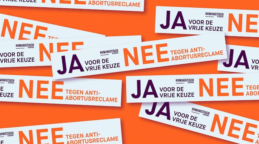 De strijd om (anti)abortus wordt ook via drukwerk uitgevochten. Het Humanistisch Verbond heeft een NEE-sticker ontworpen voor iedereen die geen anti-abortusreclame wil ontvangen.