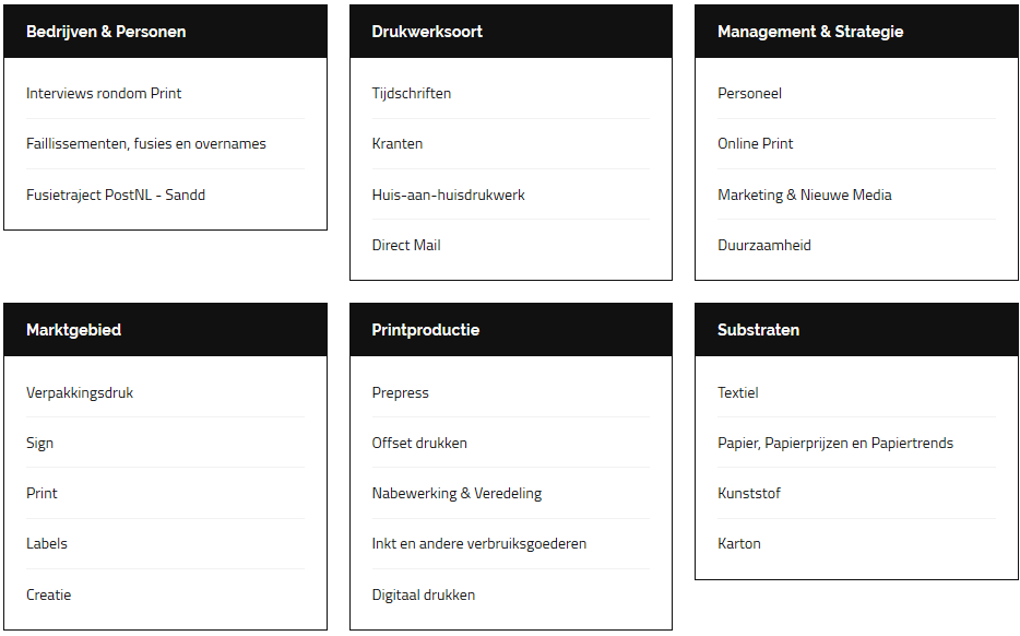 De dossiers in de Kennisbank van PRINTmatters worden constant aangevuld op basis van nieuw gepubliceerde content. Ook worden geleidelijk meer whitepapers en opiniestukken toegevoegd. De 25 dossiers zijn gerangschikt onder zes categorieën. Zie het screenshot hieronder.