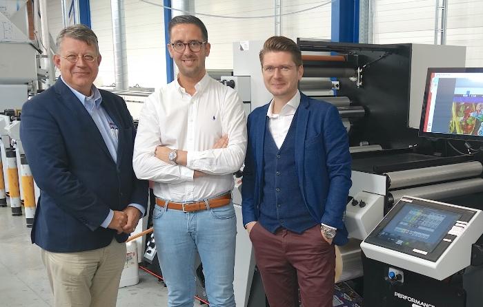 Foto v.l.n.r.:: Maarten van Bergeijk van Packtion, Michaël Thorrez en Timo Donati de European sales manager bij Mark Andy.