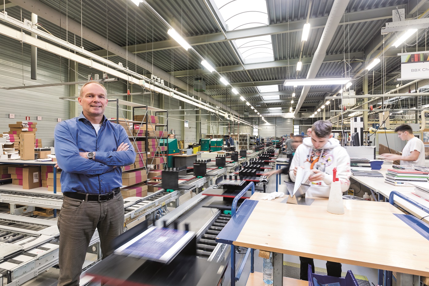 Adriaans leidt ons rond door de grote productieruimte. Drie hoofdactiviteiten vinden hier plaats: boeken, semi-automatische printproductie en fulfilment: de assemblage of afwerking van producten die een extra touch behoeven: een banderolletje om een verpakking, de opvulling van een doos, etc. Adriaans: ‘De mix van deze drie activiteiten is vanuit margeperspectief cruciaal en verschilt van dag tot dag, zelfs bijna van uur tot uur. De mensen die hier werken zijn dan ook flexibel inzetbaar en deels huren we hen in via onze uitzendpartner. Als het bij de productie even wat rustiger is, kunnen we de medewerkers inzetten bij één van de andere twee afdelingen en omgekeerd. Wij analyseren die mix constant, ook met het oog op de langere termijn. Zo hebben we binnenkort een strategische bijeenkomst met regionale fulfilmentbedrijven om te bekijken hoe we elkaar kunnen versterken. We geloven heilig in partnerships.’