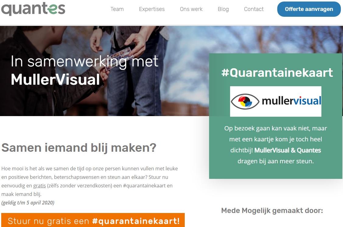 De grafimediabedrijven MullerVisual in Mijdrecht en Quantes in Rijswijk zijn een actie gestart, waarmee iedereen een ander – je collega, je vriend of je oma- een zogenoemde #quarantainekaart kan sturen. Gratis.