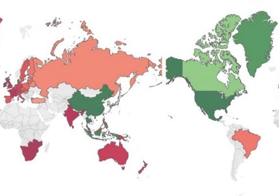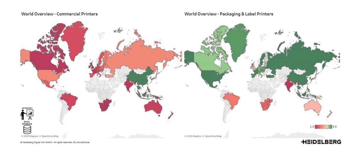 Heidelberger Druckmaschinen AG (Heidelberg) presenteert voor het eerst haar klimaatrapport over de gedrukte media-industrie. Het bedrijf geeft wekelijks updates over de ontwikkeling van printvolumes in de marktsegmenten voor verpakking en etiketten en commercieel drukwerk. De representatieve basis van de geanonimiseerde gegevens wordt gevormd door ongeveer 5.000 geselecteerde offsetpersen van alle formaatklassen bij klanten over de hele wereld die zijn aangesloten op de Heidelberg Cloud. De huidige gegevens voor ongeveer 50 landen worden hier per segment geselecteerd en weergegeven op een wereldkaart. De kleuren op de landkaart zijn indicatoren voor hoe de geschatte huidige productie in drukkerijen wordt vergeleken met het voorgaande jaar. De schaal varieert van 1 (ernstige impact van COVID-19 op de productie) tot 8 (productie boven het niveau van vorig jaar), waarbij 7 de productie op het niveau van vorig jaar vertegenwoordigt.