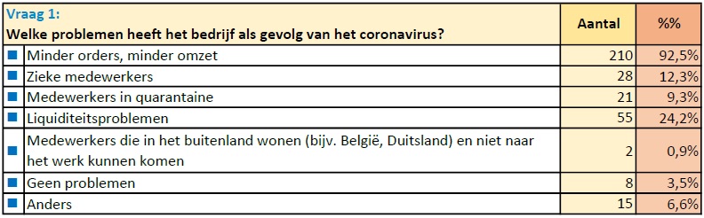Op de vraag welke problemen het bedrijf heeft door het coronavirus, geeft 96 procent één of meerdere problemen aan. Dat is een geringe stijging ten opzichte van de eerste enquete in maart, toen 94 procent liet weten één of meerdere problemen door het virus te hebben.