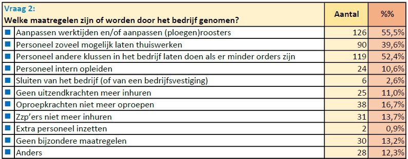 Van de invullers geeft 87 procent aan één of meerdere maatregelen te hebben genomen in reactie op de gevolgen van het coronavirus. Hierbij valt vooral de flexibiliteit op: 56 procent past de werktijden en/of de ploegenroosters aan, in 52 procent van de bedrijven pakken de medewerkers andere klussen op als er minder orders zijn en 40 procent van de bedrijven laat medewerkers zoveel mogelijk thuiswerken. Evenals vorige maand zoeken bedrijven ook naar flexibiliteit door het verminderen van de inzet van de flexibele schil. Iets minder dan een kwart geeft aan dit te doen. Slechts 1% van de bedrijven moet juist extra personeel inzetten.