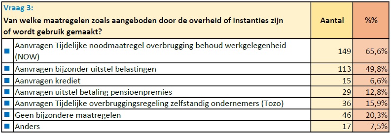 Net als in de vorige enquête komt naar voren dat de financiële steunmaatregelen vanuit de overheid en andere instanties hard nodig zijn: 80 procent maakt hier gebruik van. Het merendeel, 66 procent, heeft de Tijdelijke noodmaatregel overbrugging behoud werkgelegenheid (NOW) aangevraagd. Deze regeling geeft een tegemoetkoming in de loonkosten bij afname van de omzet. De NOW geldt in eerste instantie voor drie maanden.