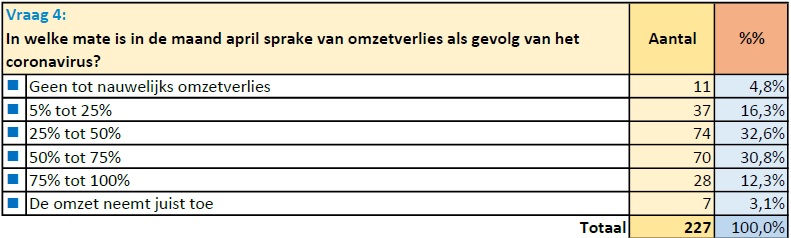 Gevraagd naar het omzetverlies in de maand april geeft 92 procent van de bedrijven aan in meer of mindere mate omzetverlies te hebben geleden. Die is weliswaar fors, maar lijkt gelukkig enigszins mee te vallen ten opzichte van de verwachting: in maart verwachtte nog 24 procent een omzetverlies in april tussen de 75 en 100 procent tegenover 12 procent dat aangeeft in deze maand daadwerkelijk een dergelijke extreme mate van omzetverlies te hebben gehad. Méér bedrijven dan in de vorige enquête dit verwachtten, hadden in april een omzetverlies tussen 5 en 25 procent (16 procent tegenover 11 procent) of tussen 25 en 50 procent (33 procent tegenover 26 procent).