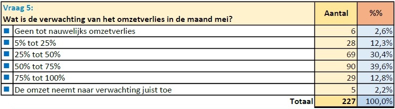 Het beeld voor de maand mei laat een verdere verslechtering zien. Maar liefst 95 procent van de invullers van de enquête verwacht in mei omzetverlies te zullen lijden. Een omzetverlies tussen 25 en 75 procent wordt verwacht door 70 procent van de bedrijven.