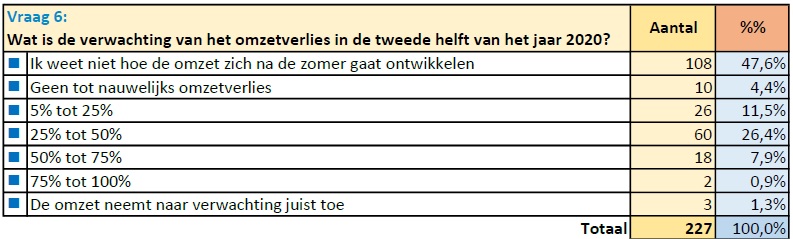 Gevraagd naar de verwachting van het omzetverlies in de tweede helft van 2020 geeft bijna de helft (48 procent) aan niet te weten hoe de omzet zich na de zomer gaat ontwikkelen. Iets meer dan een kwart van de bedrijven verwacht een omzetverlies tussen de 25 en 50 procent en 9 procent verwacht een omzetverlies van 50 procent of meer. Een enkeling is positief gestemd: slechts 1% verwacht een toename van de omzet.