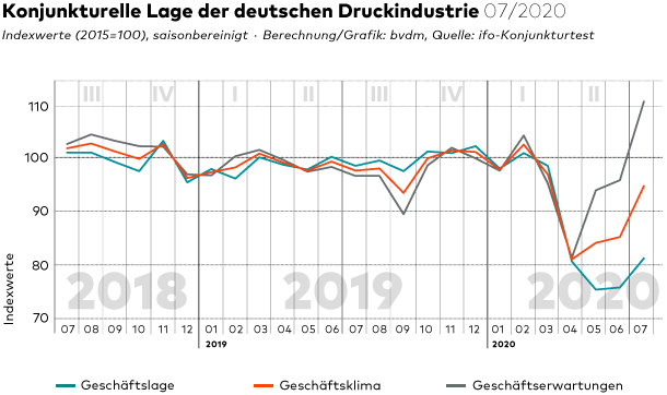 Het klimaat in de Duitse print- en mediasector is in juli merkbaar verbeterd. Zeker ten opzichte van begin mei toen de alarmbellen heel luid rinkelden. De door het Bundesverband Druck und Medien (BVDM) berekende bedrijfsklimaatindex steeg in juli met 11,2 procent in vergelijking met de voorgaande maand en steeg voor de derde keer op rij. Met 85,2 punten ligt de index nu slechts 2,9 procent onder het niveau van vorig jaar. In juli beoordeelden de door het Ifo Institute ondervraagde print- en mediabedrijven zowel hun huidige bedrijfssituatie als hun verwachte bedrijfssituatie zichtbaar beter dan in juni. De waarden van de huidige en verwachte bedrijfssituatie bepalen de ontwikkeling van het bedrijfsklimaat, wat een goede indicator is voor de ontwikkeling van de productie in de grafische en media-industrie.