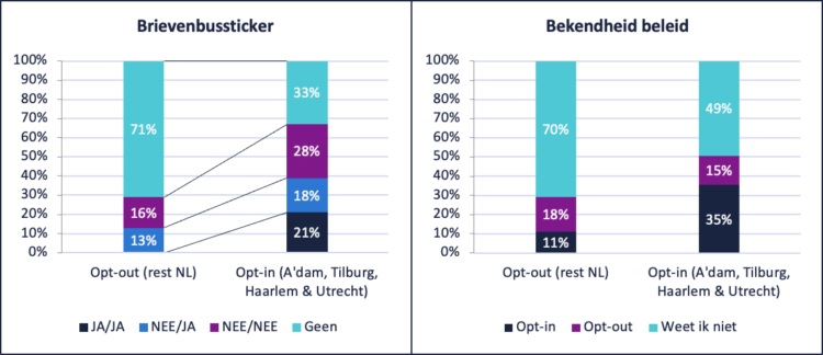 Tot voor kort kende heel Nederland het opt-out systeem voor ongeadresseerd drukwerk. Indien je geen folders en/of huis-aan-huisbladen wil ontvangen, plak je een NEE/NEE of NEE/JA sticker op je brievenbus die dat aangeeft. Het opt-in systeem, zoals dat momenteel in Amsterdam, Utrecht, Haarlem, Tilburg en ook Den Haag geldt, gaat uit van het omgekeerde verhaal. Je moet nu een JA/JA sticker plakken als je juist wél ongeadresseerd reclamedrukwerk en hah-bladen wil ontvangen. Deze steden zijn voorlopers, maar de verwachting is wel dat dit systeem binnen enkele jaren de overhand zal hebben.