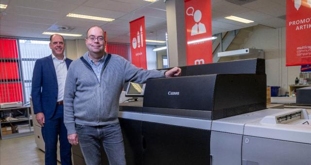 Afgebeeld: Account manager van Canon Nick de Haan (links) en Leendert Bedijn, eigenaar van Multicopy The Communication Company in Noordwijk en Rijswijk, bij de Canon imagePRESS C10010VP.